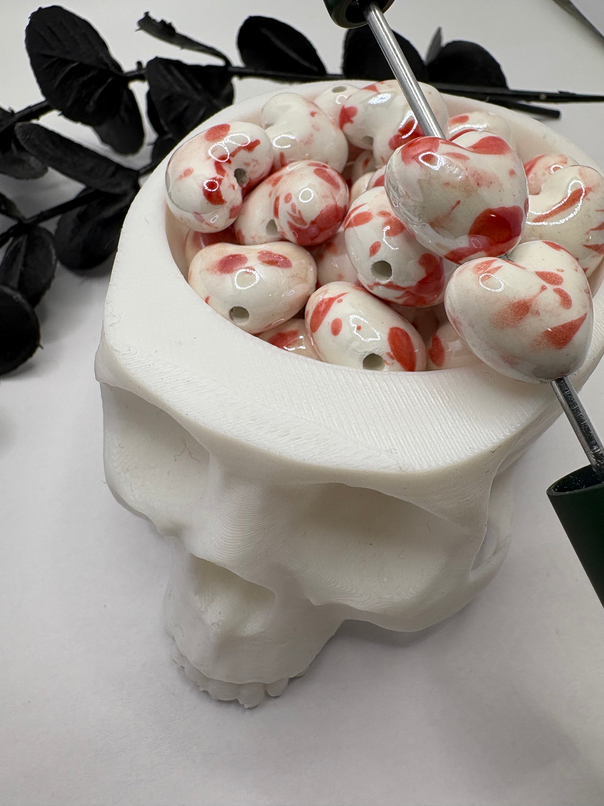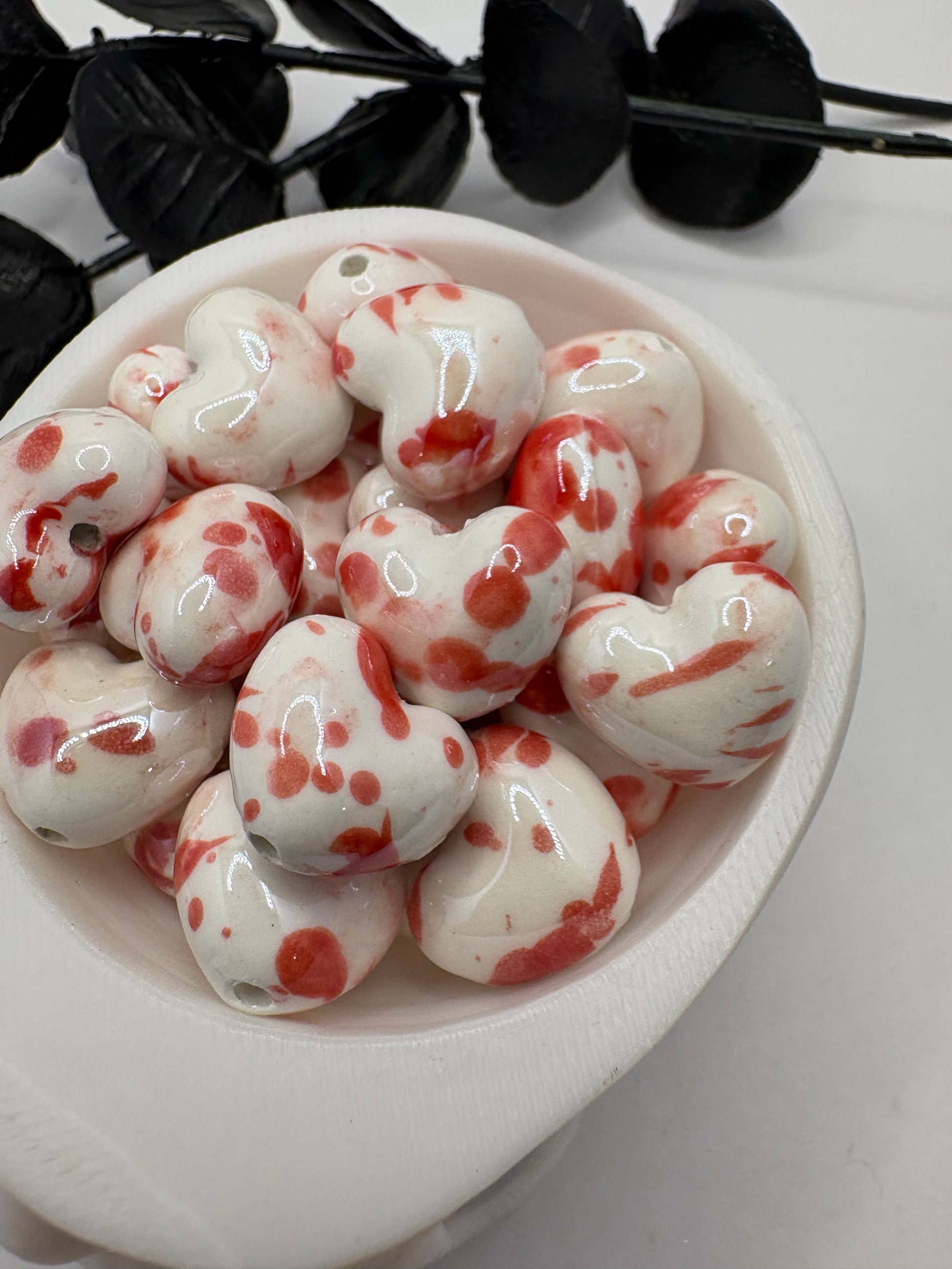 Ceramic Heart red splattered beads, 10mm beads for pens, beading supplies, 5pc ceramic beads